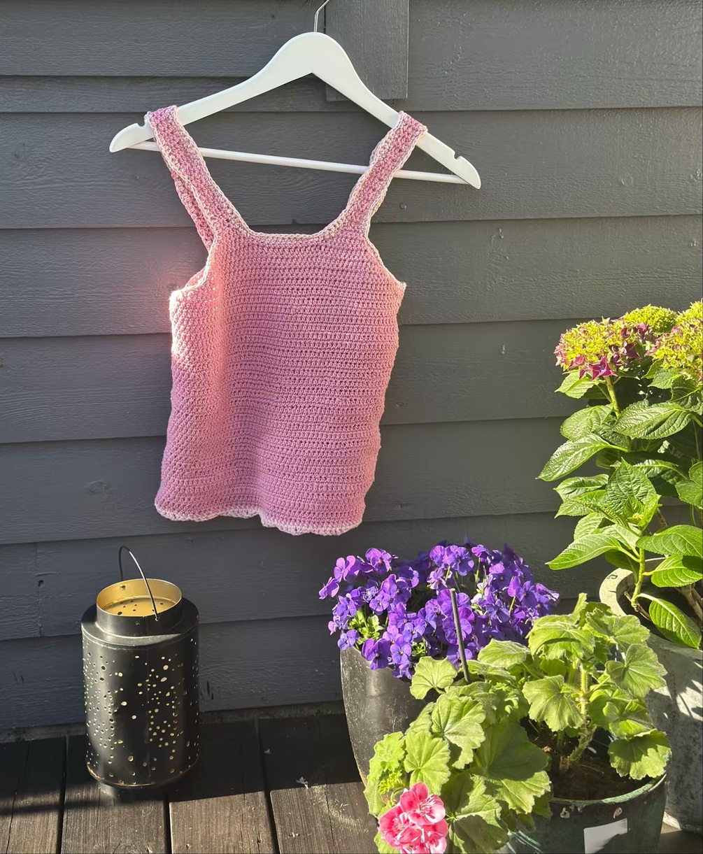 Denne toppen er heklet rundt og rundt fra bunnen og opp, med en enkel forming i front og tilpassede stropper. Den er beregnet på å være tettsittende, men mønsteret er lett å tilpasse til ulike størrelser og garn.